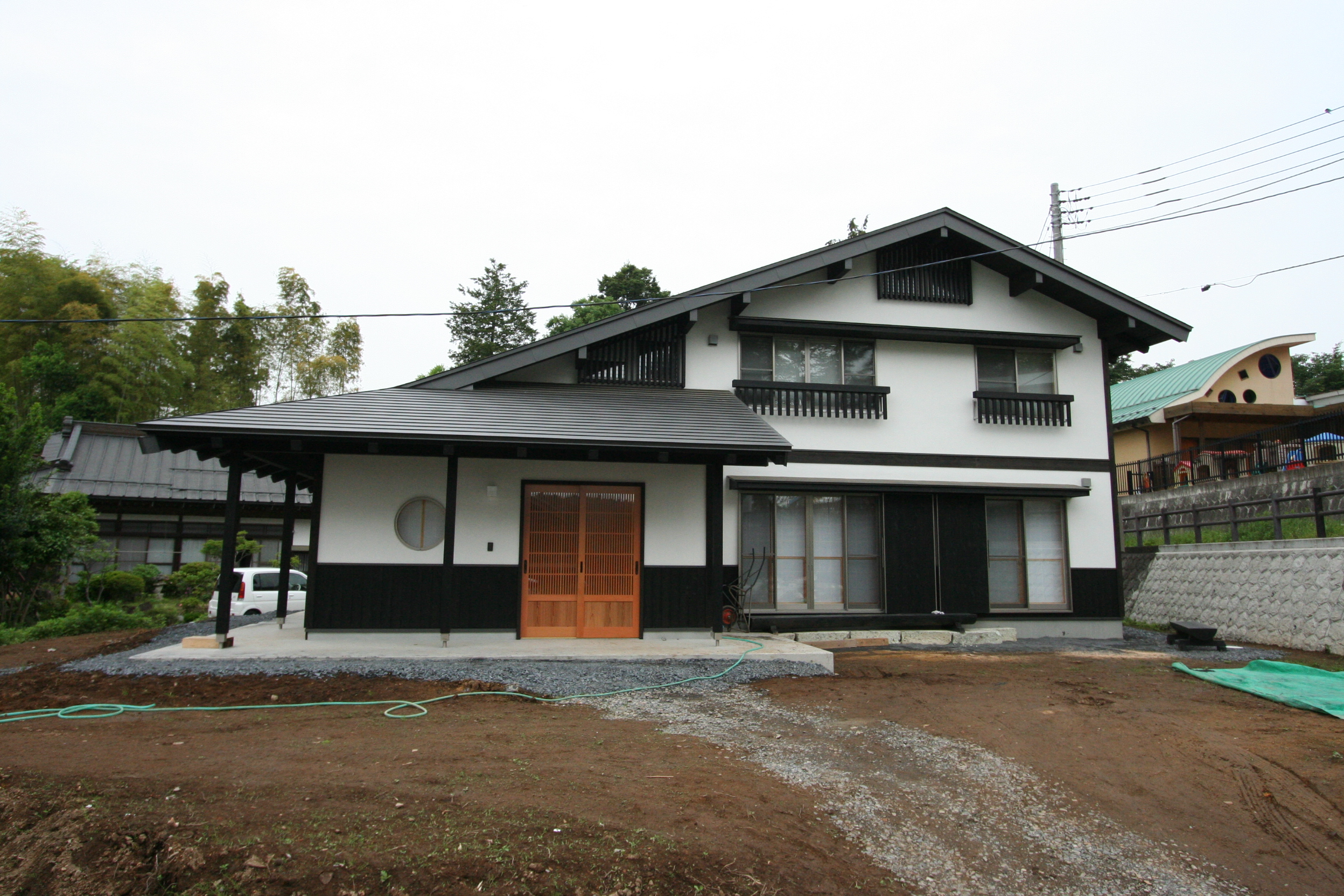 大屋根切妻、白外壁の家